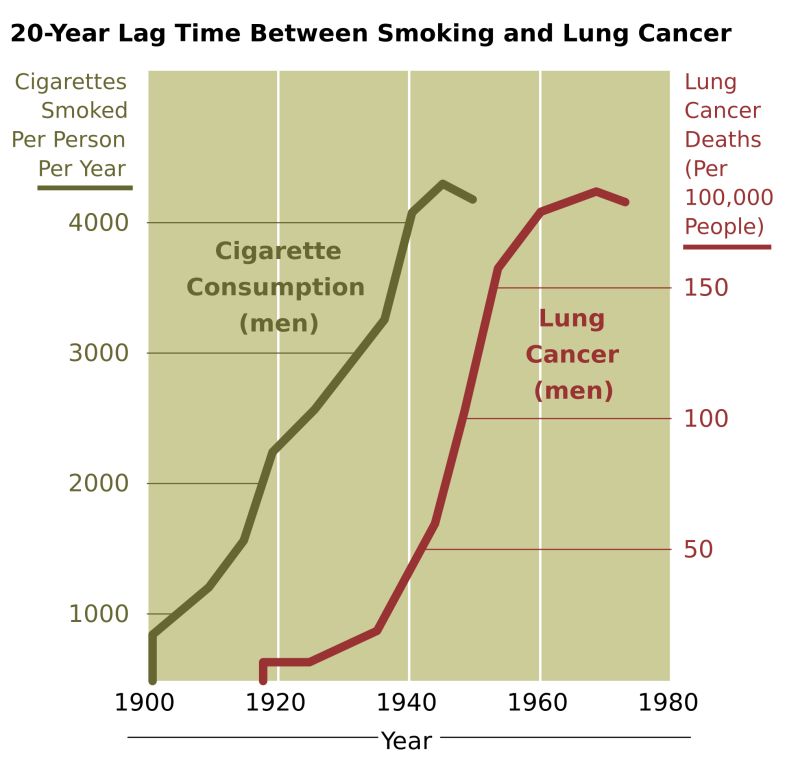 There are different types of evidence that suggest a causal link between smoking and lung cancer. The trend in US lung cancer rates was pre-empted by the trend in US smoking rates over much of the 20th Century (see Figure 1). There is a several hundred year history of evidence that suggests a link between smoking and cancer. But it wasn’t until 1950 that Doll and colleagues found convincing evidence that suggested smokers were more likely to die of lung cancer than non-smokers (in the US and the UK). But was this causal evidence? There were, and still are, a range of differences between smokers and non-smokers, and any one of these differences could be the cause of lung cancer, rather than smoking. For example, people who smoke are less likely to exercise, so exercise might be a confounder in the relationship between smoking and lung cancer. This is because people who do not exercise are more likely to be ‘selected into’ smoking (a form of selection bias), and are therefore systematically different from non-smokers. Causal inference can be problematic if research does not consider all the factors that might be responsible for confounding or selection. Even after Doll’s work was published, the statistician Ronald Fisher was one of several notable critics who argued that the link between smoking and cancer was explained by other factors, and therefore a spurious association (another term for confounding). For a discussion and references see here.