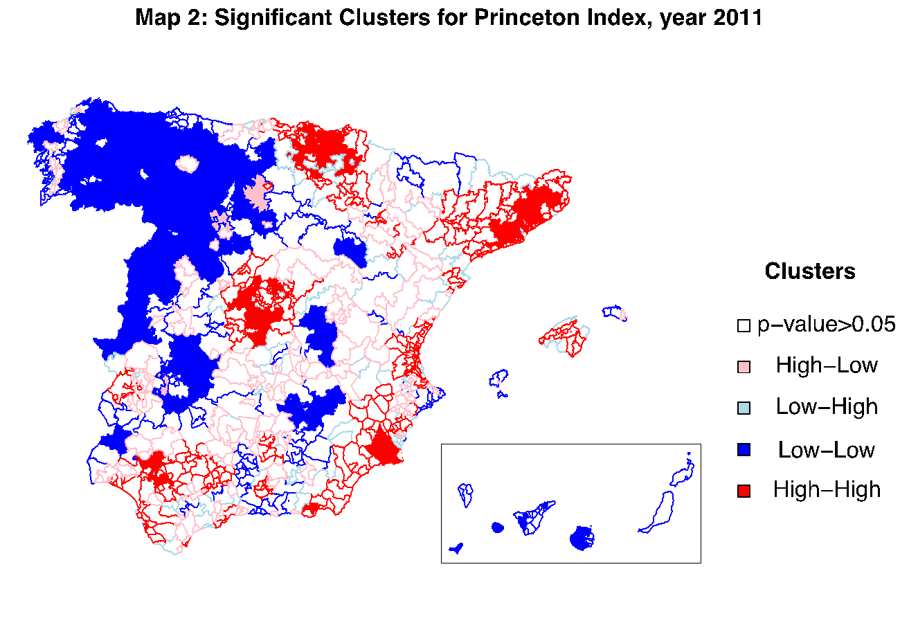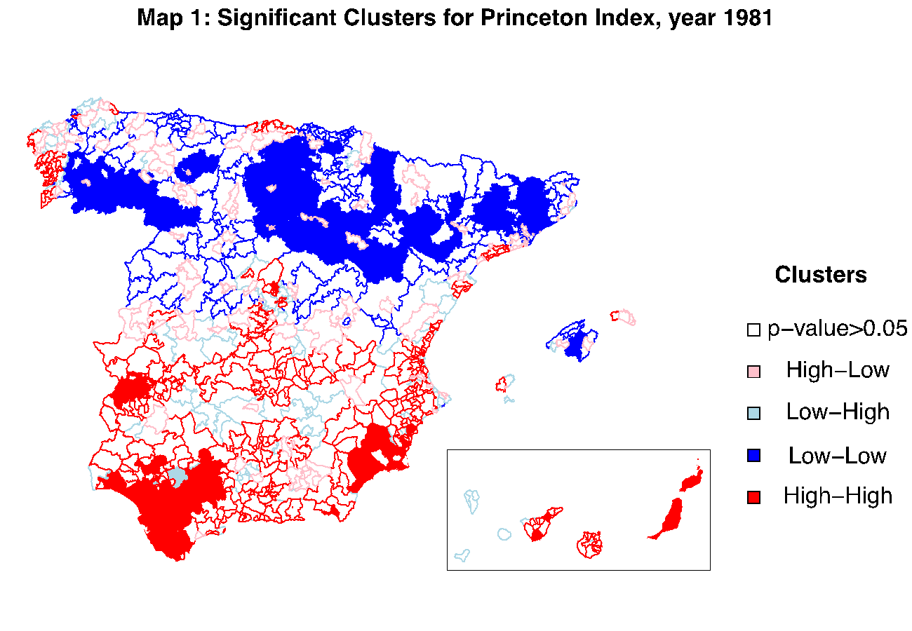 Recent works in the field of spatial demography have evidenced that adding the time dimension to spatial analysis can provide insights about the adoption of a new demographic regime and how its constituent variables are impacted through time. This is an important matter, as we learned from the Princeton project that the spatial dimension is crucial to understand the diffusion processes during the First Demographic Transition in Europe (Coale & Watkins, 1986). However in most of the studies of the Second Demographic Transition, the spatial component is often overlooked. This is in part due to data availability and also because demographic transitions are thought of as the result of a country specific processes. But focusing on the national level rather than the local one when analyzing changes in the demographic regime, we generally miss out precursors as well as laggards. One classical example in Spain is the region of Catalonia, which was a precursor for both the First and the Second Demographic transitions compared to the rest of the country and specifically Southern regions. Map 1. Significant clustrs for Princeton index, 1981Map 2. significant clusters for Princeton index, 2011
