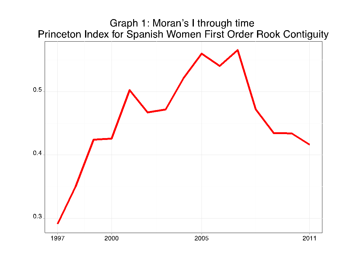 Therefore, it is quite straightforward to see how spatial autocorrelation can alter the result of a study that does not take space into consideration, hence the old property adage, “location, location, location!” can also apply also to demography. In the context of spatial heterogeneity of fertility, Spain is a unique country in Europe, with a long and well-documented regional and provincial diversity for more than two centuries. Having a look at municipal fertility changes over the last three decades can be very indicative of how 1. Fertility declined with different paths, 2. The recent recuperation of fertility has interested only determined areas until the onset of the recent economic crisis, 3. Migration has deeply affected fertility patterns in big cities, but left other regions unaffected. Looking at global measures of autocorrelation (see Graph 1), we can understand why spatial dependence is a time evolving phenomenon that can change and reverse its path. For instance, Graph 1 depicts how in times of economic -and fertility- expansion, spatial autocorrelation reaches its peak, while in times of economic recession -and fertility decline- it plummets, leveling off much of fertility differentials across regions. This is mainly due to the way individuals try to cope with distressed times by delaying births until better times come. The two LISA cluster maps group the variable of interest, in this case Princeton Index, using a four-groups local statistic divided as: red high-high clusters of areas with -relatively- high fertility surrounded by high fertility, dark blue low-low clusters, light red high-low clusters of high fertility areas surrounded by low fertility and light blue low-high clusters. The traditional division of Spain into high fertility South and low fertility North has been shifted from the mid-90s into an East-West divide with big cities as hot-spots for high fertility, as shown in the LISA maps 1 and 2.