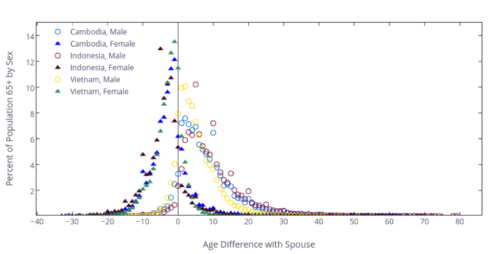 Older men in Cambodia, Indonesia, and Vietnam are 6, 8, and 4 years respectively in median age older than their spouses. Both Cambodian and Vietnamese older women are 2 years younger while Indonesian women are 4 years younger, in median, than their husbands. A clear difference between the sexes is evident in Figure 1, which depicts the percentage of population 65+ by the age difference with one’s spouse. Women, in all three countries, hover on the left side of the zero line, showing that they tend to be younger than their spouses. On the other hand, men overall tend to marry younger woman, with a small percentage marrying much younger women. The data does not specify whether a marriage is the first or second marriage. Since the data is based on co-residence and not marriage records, women who are 65 years or older who have married much older men are likely to no longer reside with them, as the spouses are presumably no longer alive.