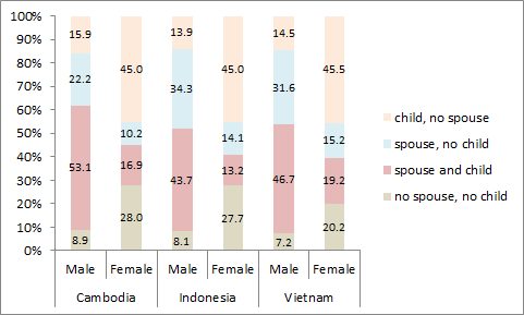 Considering the fact that elderly men in the sample marry younger women, and much younger in some cases, it is no surprise that those children from such unions are likely to be younger than the children of women 65+ in the sample. Therefore, elderly men have more opportunity to reside with their younger, living spouse, and also have a higher likelihood to live with both their spouse and child compared to women in the same age group. In the case of Cambodia, over half of the elderly men reside with both their spouse and their child in the form of a dual parent household, when only roughly 17 percent of women live in the same type of household, as shown in Figure 2. However, intergenerational co-residence for elderly women is more likely to take place when the husband is no longer around. Indonesia and Vietnam show a similar picture. The individuals living with neither a spouse nor a child tend to live with other relatives, such as a grandchild, because solo living for the elderly remains to be uncommon in Southeast Asia, especially in Cambodia.